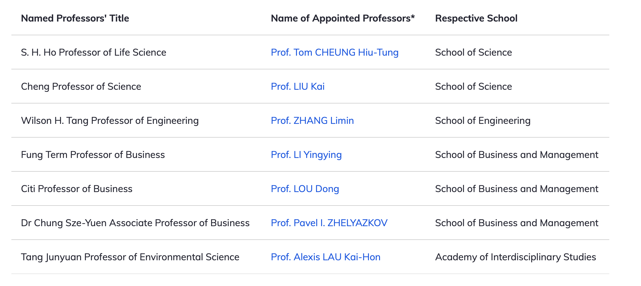 Launched in 2013, the Named Professorships was established through donations from individuals and corporations. It aims to honor and recognize eminent academics at HKUST for their contributions to the field of academia and uphold the University's remarkable tradition of academic and research excellence by attracting the best scholars in the region and from around the globe, and by retaining outstanding academicians at the University. To date, more than 70 distinguished scholars have been bestowed with the title of Named Professor. The establishment of the professorships relies on the support of philanthropists dedicated to the development of higher education in Hong Kong. This year’s corporate and individual donors include (listed in alphabetical order by corporate name and surname): Vina CHENG, Citi, Fung Group and Victor and William Fung Foundation Limited, Shanghai Tang Junyuan Education Foundation, Mrs. Bernadette TANG, The S. H. Ho Foundation Limited, and by funds set aside by the University, in honor of the contributions of the late Dr. CHUNG Sze-Yuen.